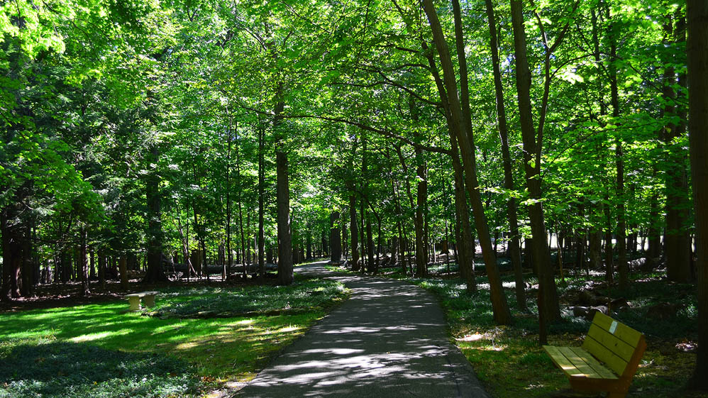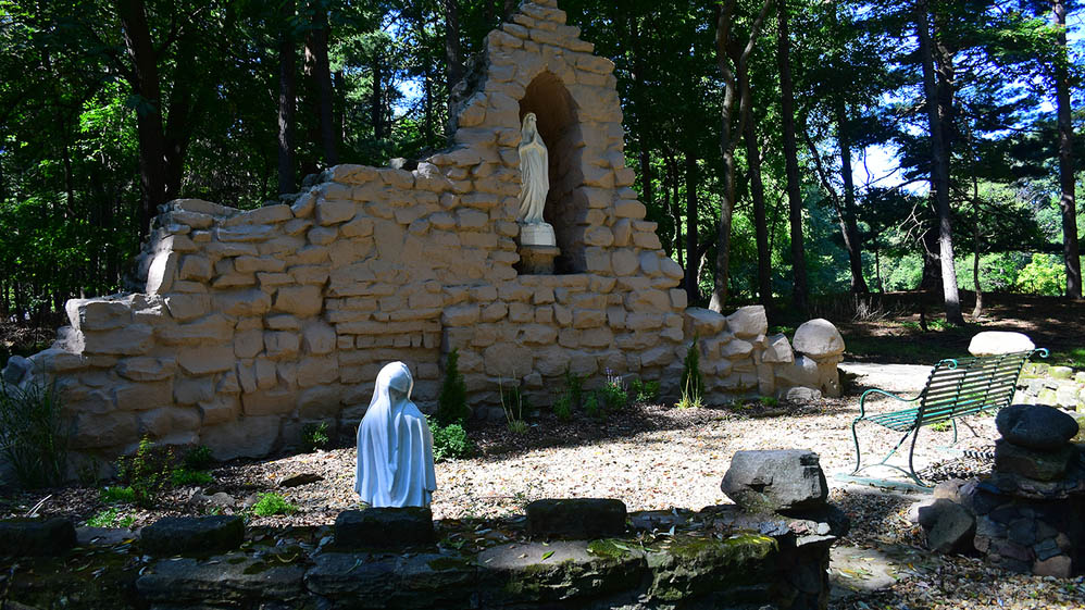 The winding road entrance through the woods immediately evokes the peace of Jesuit Retreat Center for all who arrive. There are paved walking trails throughout the site, including outdoor shrines, Our Lady of Lourdes grotto, and Stations of the Cross.